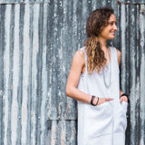 Bring on the heat with this loose fitting, luxuriously soft white linen one-piece. Big, oversized pockets add playfulness & fun to this summer signature piece.
